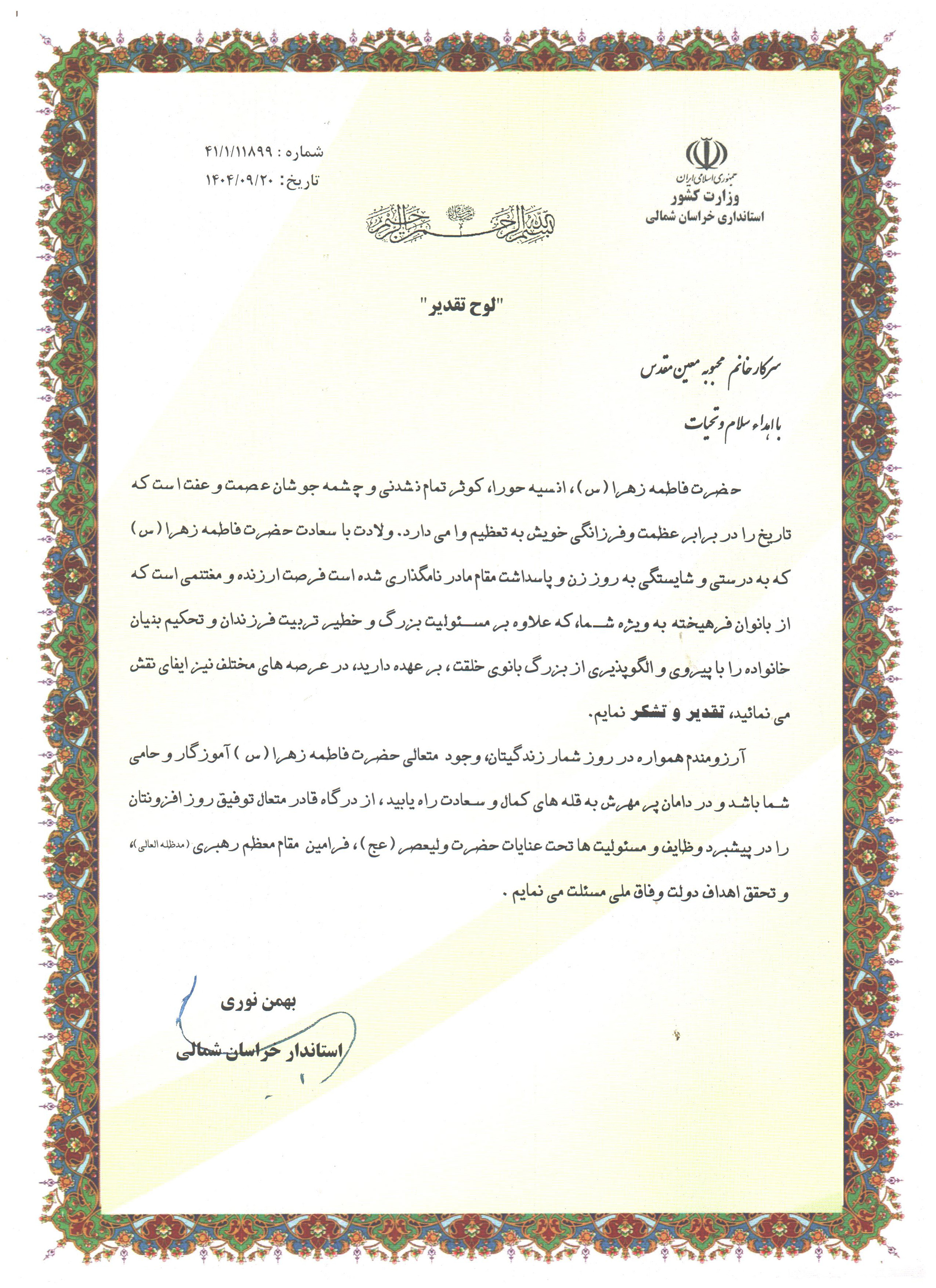 به گزارش روابط عمومی دانشگاه کوثر، مهندس بهمن نوری استاندار خراسان شمالی، از دکتر محبوبه معین مقدس رئیس دانشگاه کوثر به پاس ایفای نقش در عرصههای مختلف با اهدای لوح تقدیر، تجلیل کرد.