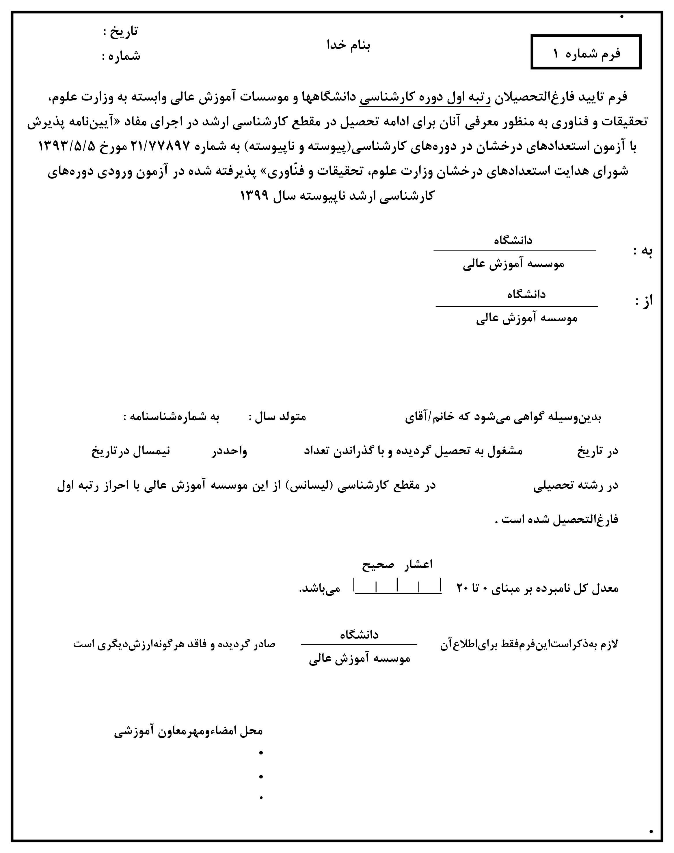 - فرم شماره 1- تأیید فارغ التحصیلان رتبه اولی دوره کارشناسی دانشگاه ها و مؤسسات آموزش عالی( دانلود)