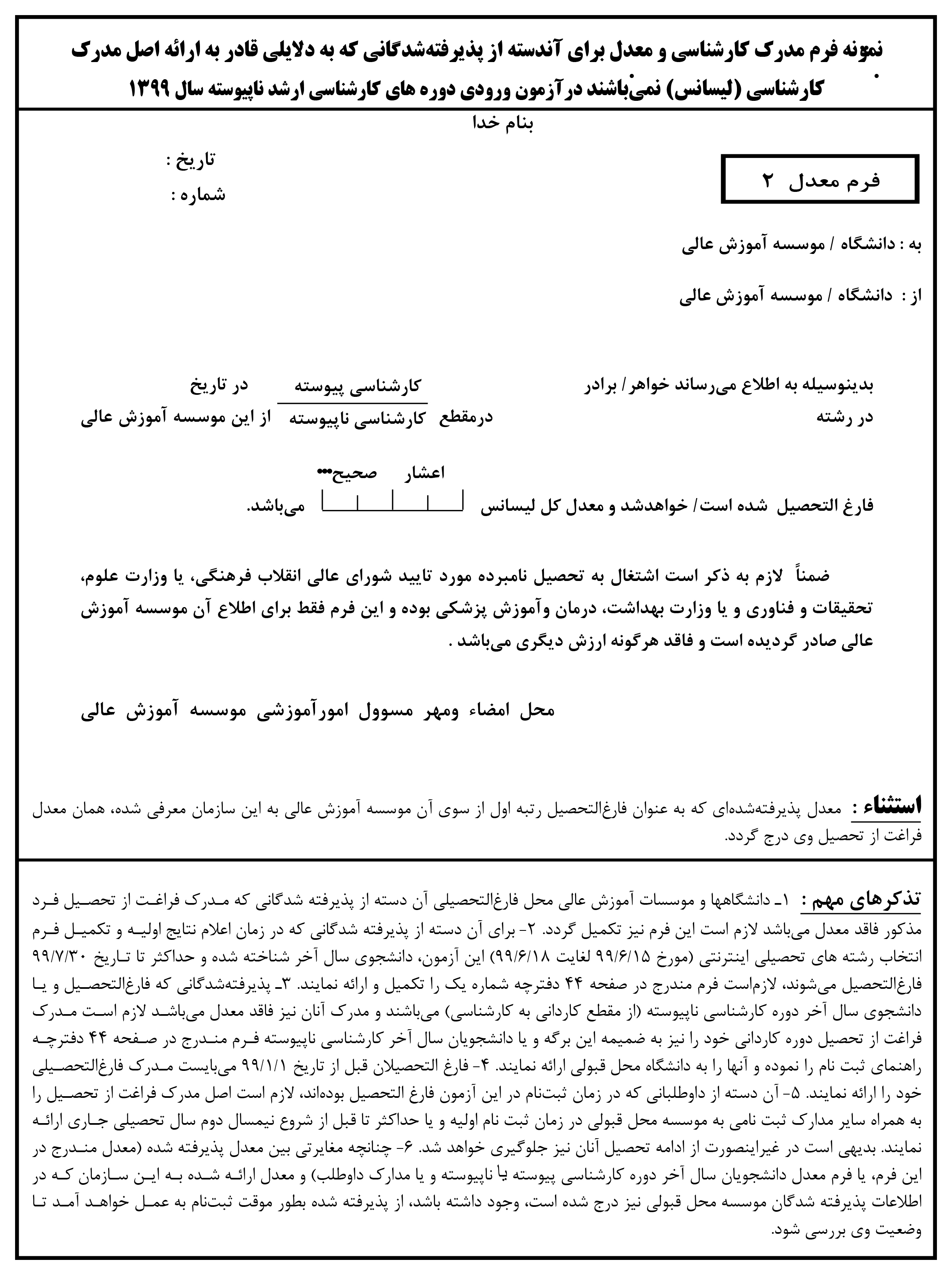 - فرم شماره2- فرم معدل برای دانشجویانی که به دلایلی قادر به ارائه مدرک کارشناسی نمی باشند.( دانلود)