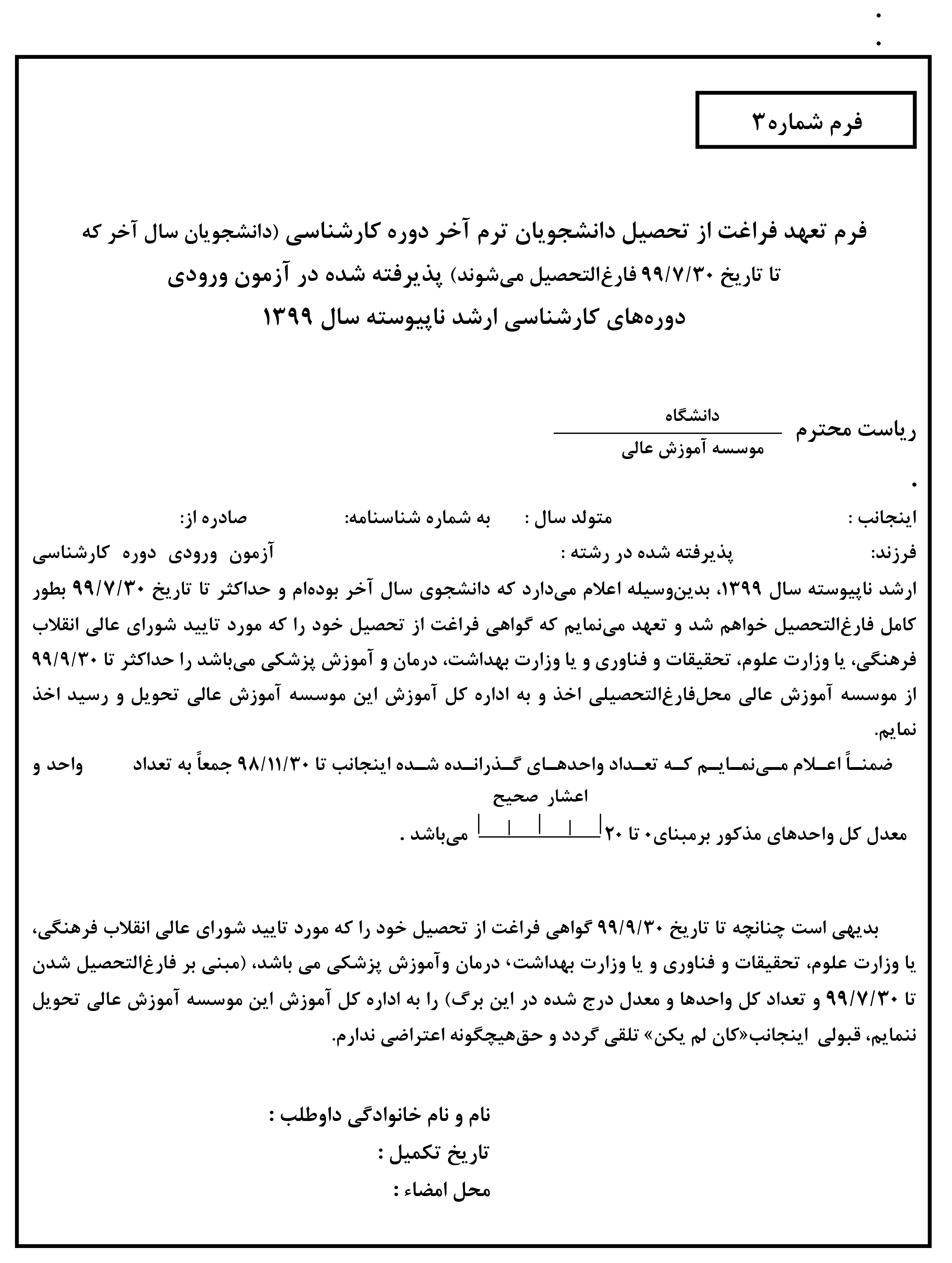 - فرم شماره3- فرم تعهد فراغت از تحصیل دانشجویان ترم آخر دوره کارشناسی( دانلود)