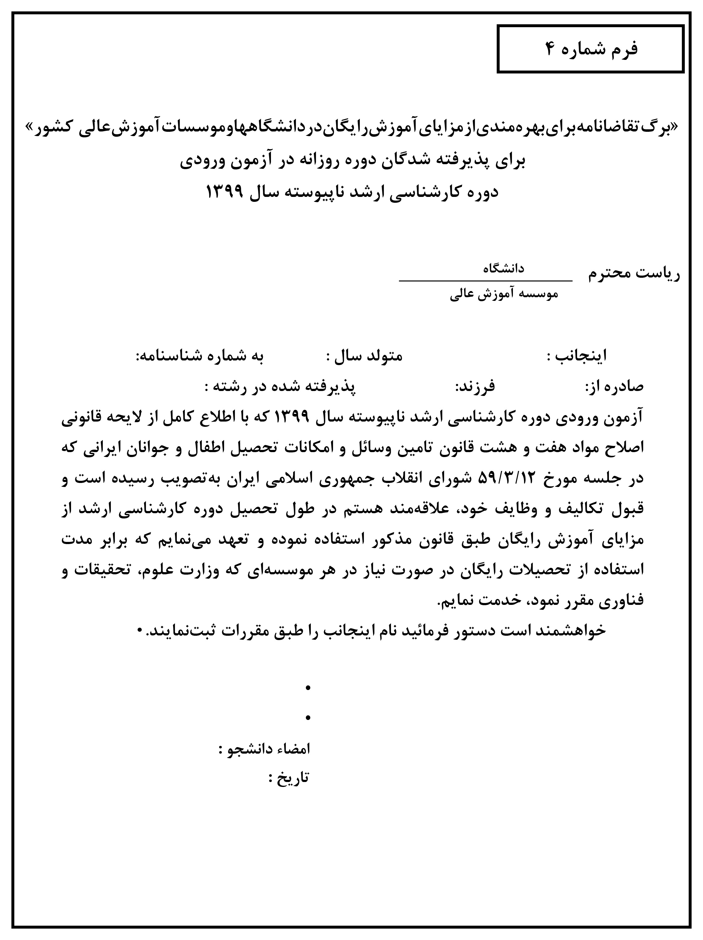 - فرم شماره4- تعهد تقاضانامه بهره مندی از مزایای آموزش رایگان( ویژه تمامی پذیرفته شدگان) ( دانلود)