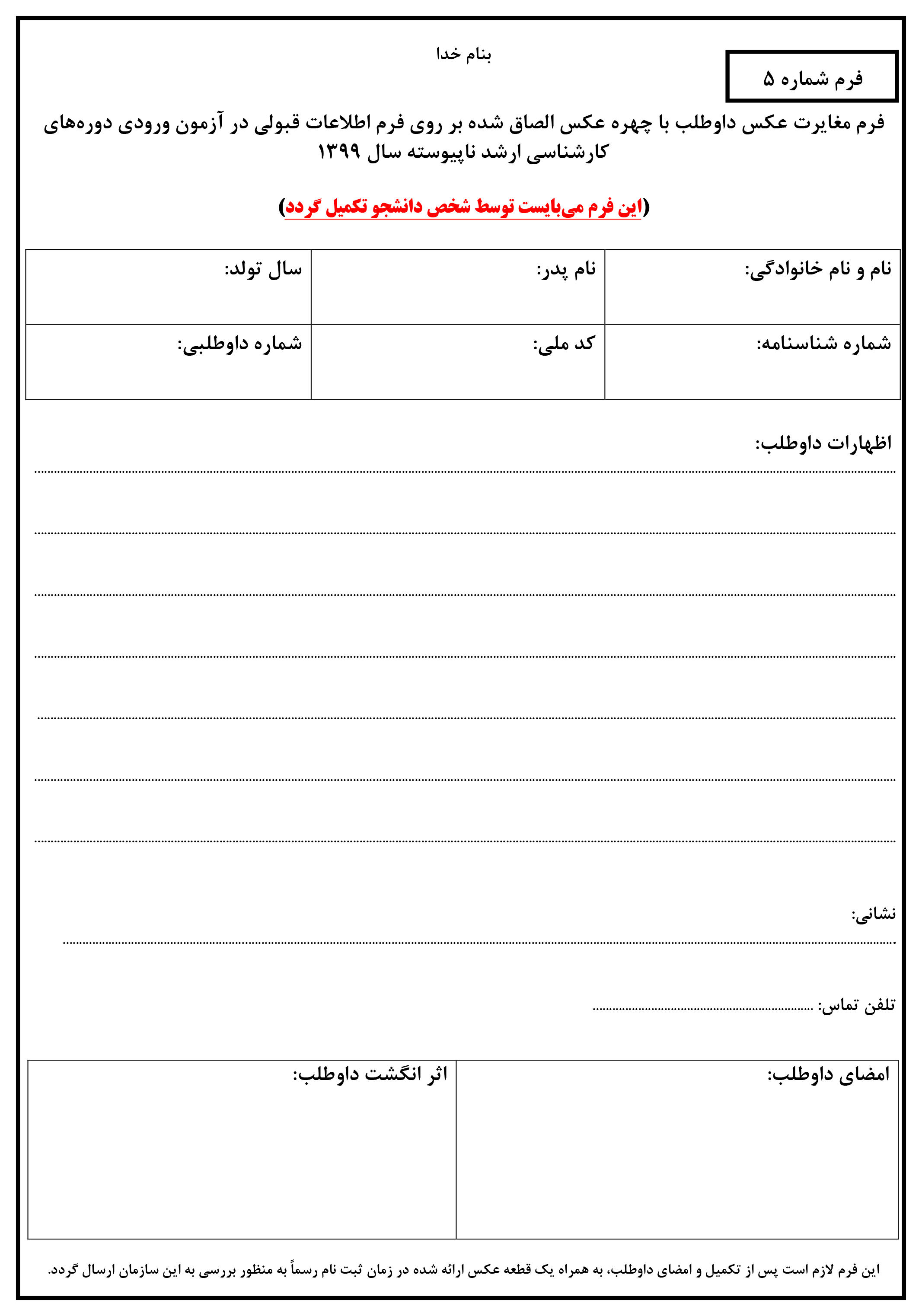 - فرم شماره5- فرم مغایرت عکس داوطلب جهت بررسی توسط دانشگاه ( ویژه تمامی پذیرفته شدگان) ( دانلود)