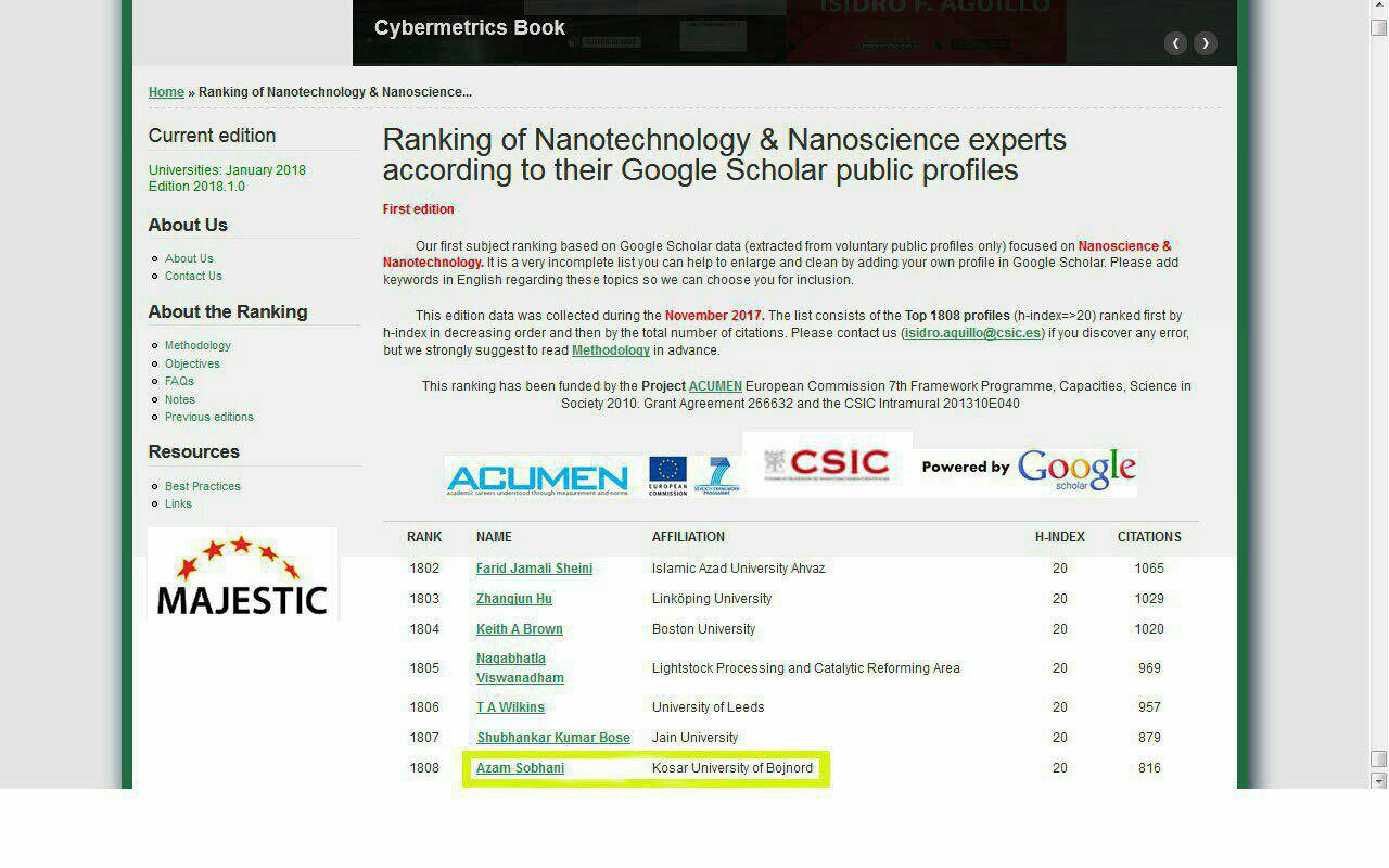 بر طبق داده‌های پایگاه استنادی گوگل اسکولار عضو هیات علمی جوان این دانشگاه با شاخص اچ ۲۰ و تعداد ۸۱۶ استناد در میان برترین پژوهشگران فناوری نانو در جهان قرار گرفت.