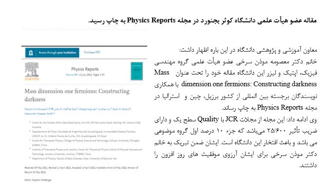 چاپ مقاله عضو هیأت علمی دانشگاه کوثر بجنورد در مجله Physics Reports - der - معاونت آموزشی و پژوهشی